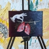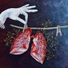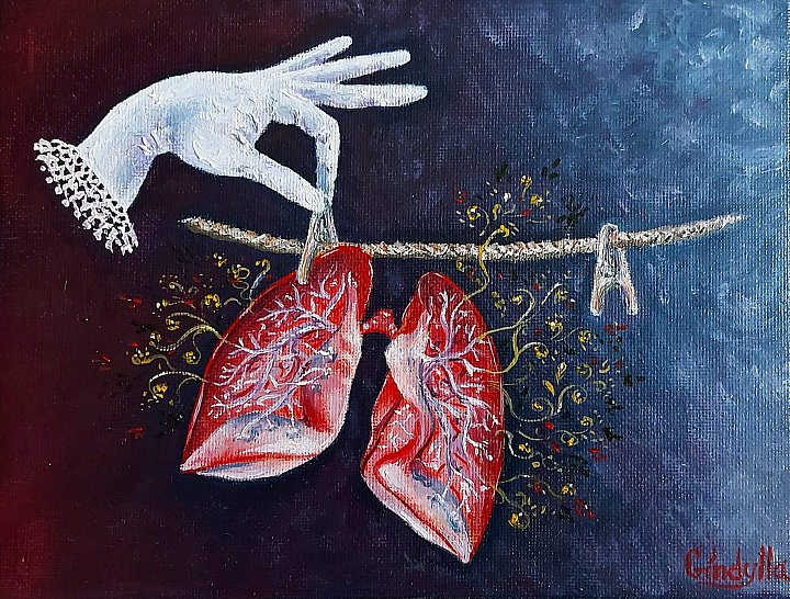 The painting is full of surrealism: a pair of realistic lungs hang on a rope like laundry, secured with clothespins and supported by a white glove. Thin branches with leaves and flowers grow from the lungs, symbolizing life and breath. The dark background emphasizes the contrast between fragile matter and the process that connects a human being with nature and existence. The work can be read as a philosophical metaphor about the interdependence of man and the world around him.