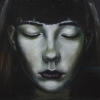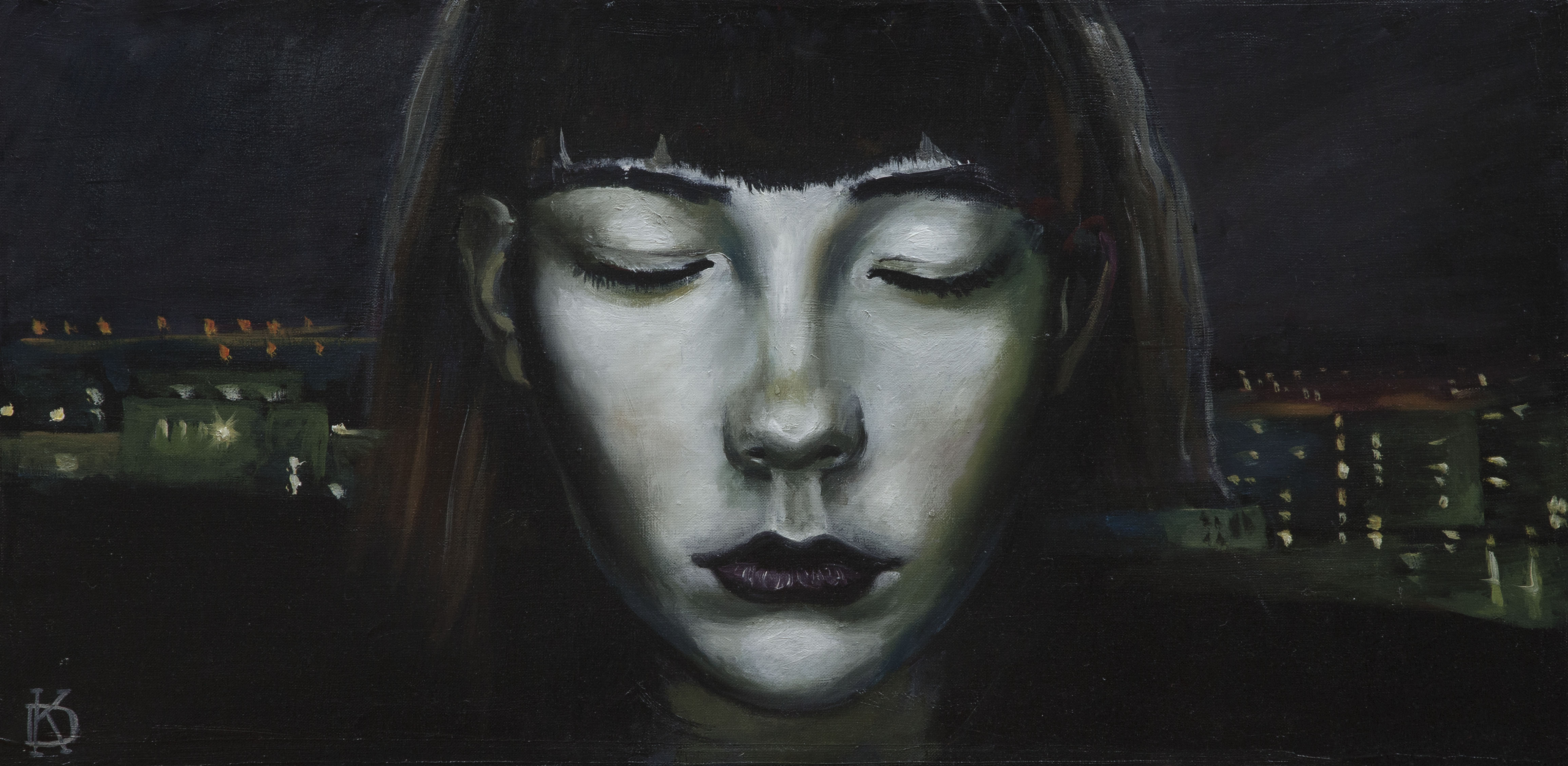 This is an emotional portrait of a girl with closed eyes, made in dark, cold shades. The face is caught by the light against the background of a night city: blurred lights below, the buildings almost dissolve in the darkness. The artist's gaze is focused on the face, where fatigue, thoughtfulness or deep sadness can be guessed. Such a portrait can reflect personal experiences, the inner world of the hero or the loneliness of a big city. The soft texture of the brushstrokes enhances the intimate atmosphere.