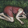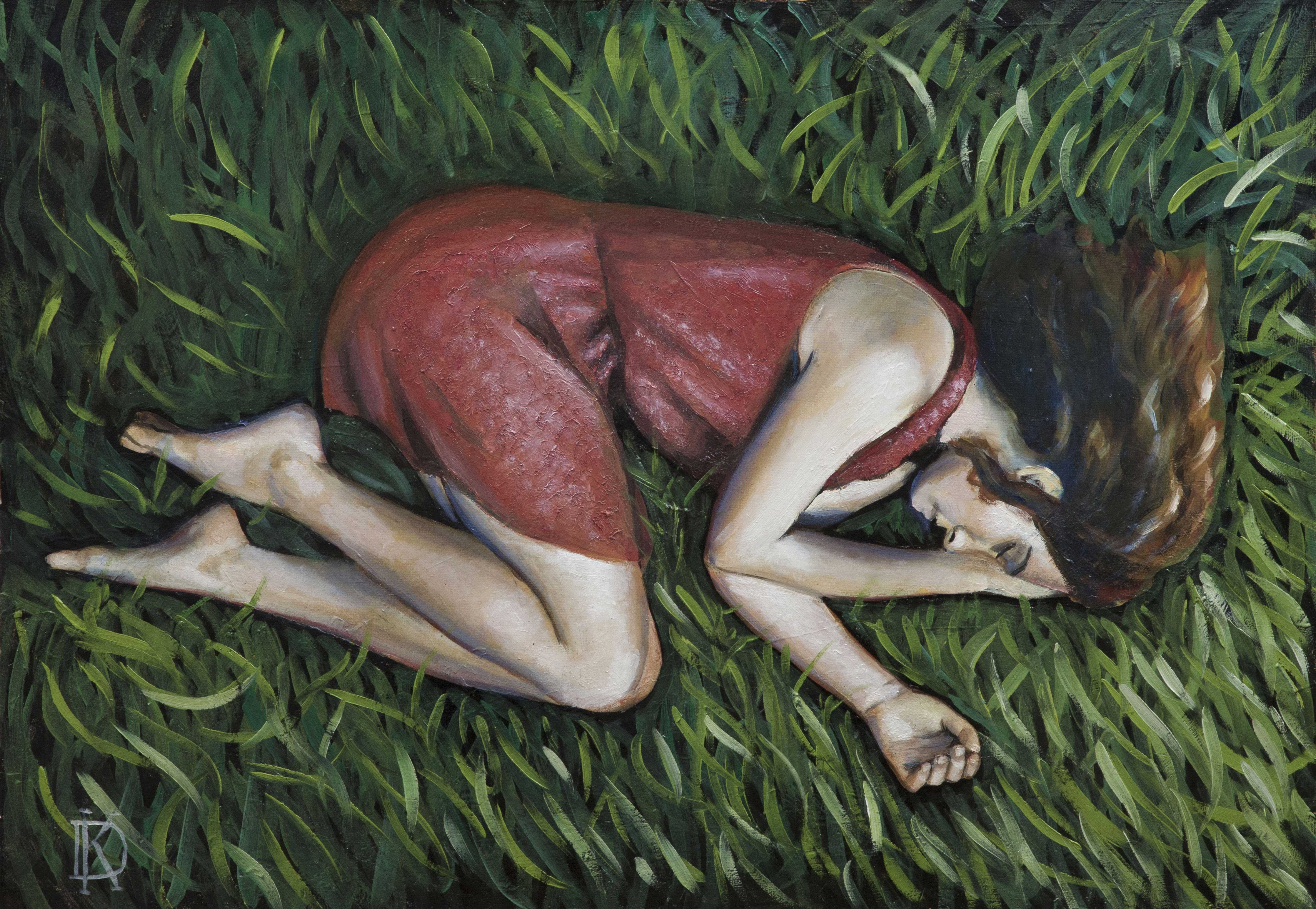 The painting appears as a large still life of a human figure. A young woman in a scarlet dress is curled up on thick green grass, as if sleeping or in a state of peace and complete harmony. The painting is filled with a sense of solitude, peace and detachment from the outside world. The contrast of the green grass and the scarlet dress emphasizes the fragility and tenderness of the figure. The work may evoke associations with a return to nature, acceptance of oneself and one's feelings, or even with the theme of withdrawal and introspection.