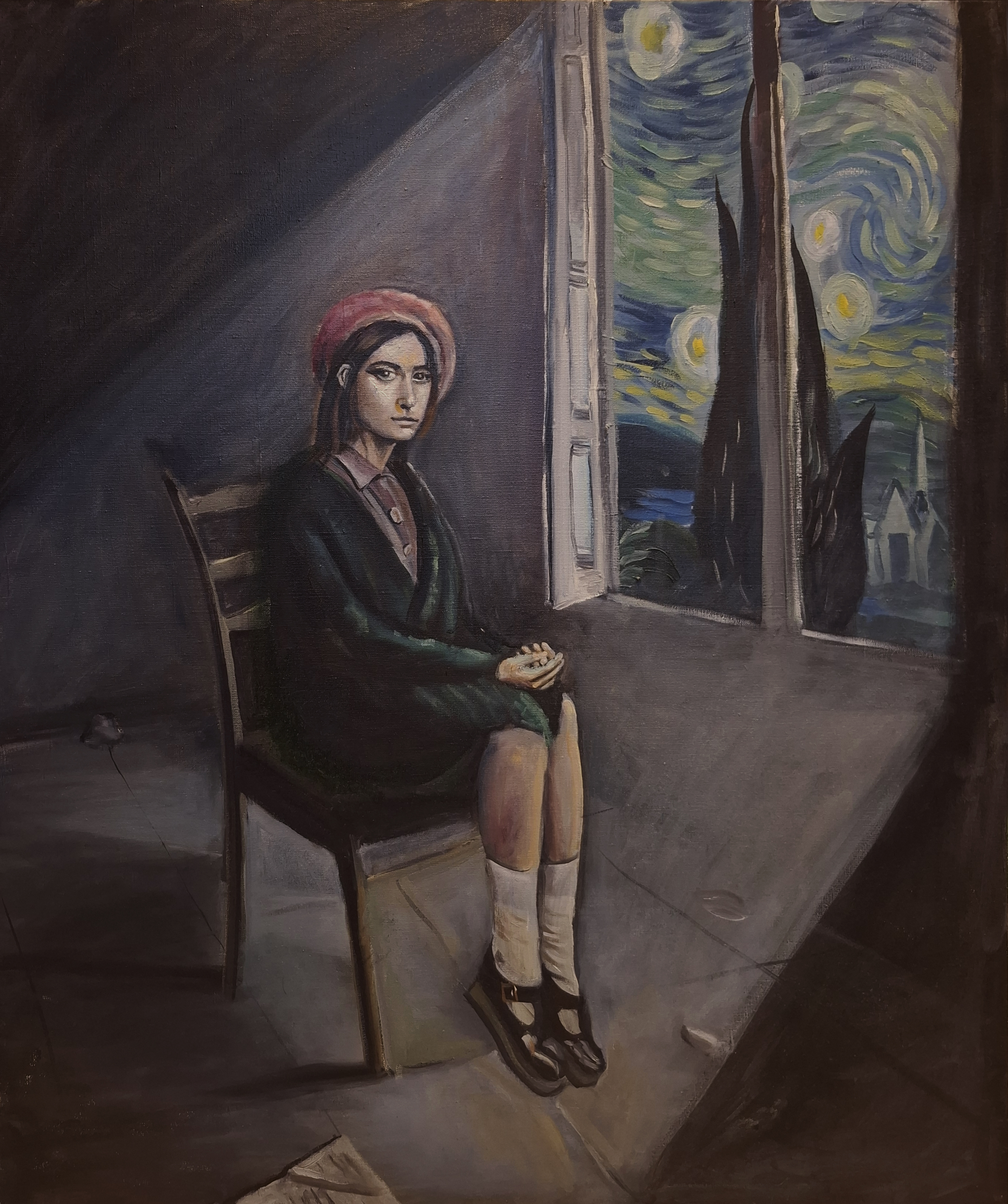 The painting depicts a young girl sitting on a simple wooden chair by a sunny window wide open. Her face shows thoughtfulness or a sense of detachment. Outside the window, a stylized motif of Van Gogh's "Starry Night" can be recognized, which creates an interesting artistic contrast and adds depth to the meaning of the work: perhaps the heroine dreams of another world filled with color, energy and dynamics, in contrast to the calm and gloomy atmosphere of the room. The slight understatement of this scene makes the viewer want to think up the heroine's story on their own.