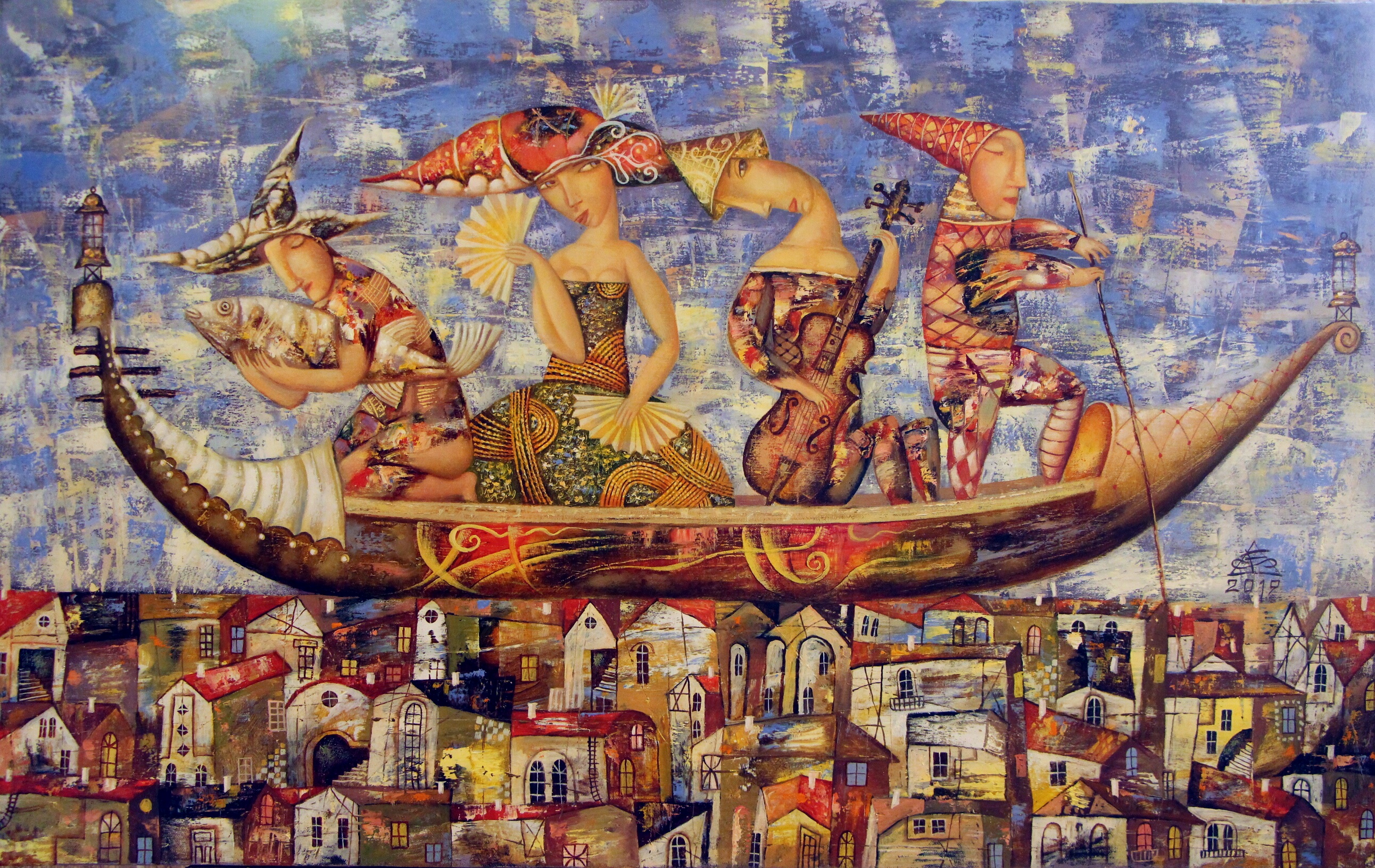 In the painting, we see a fairy-tale scene: four characters in fancy outfits are sailing on a long dragon boat in the sky above the houses of a small town. Two are playing musical instruments, the third is holding a fan, and the fourth has his head bowed to his shoulder, as if listening to a melody. The entire composition is filled with movement, fun and carelessness, reminiscent of the atmosphere of a journey, a holiday or a carnival. The artist masterfully combines musicality and a flight of fantasy with the coziness of urban scenes.