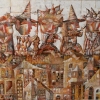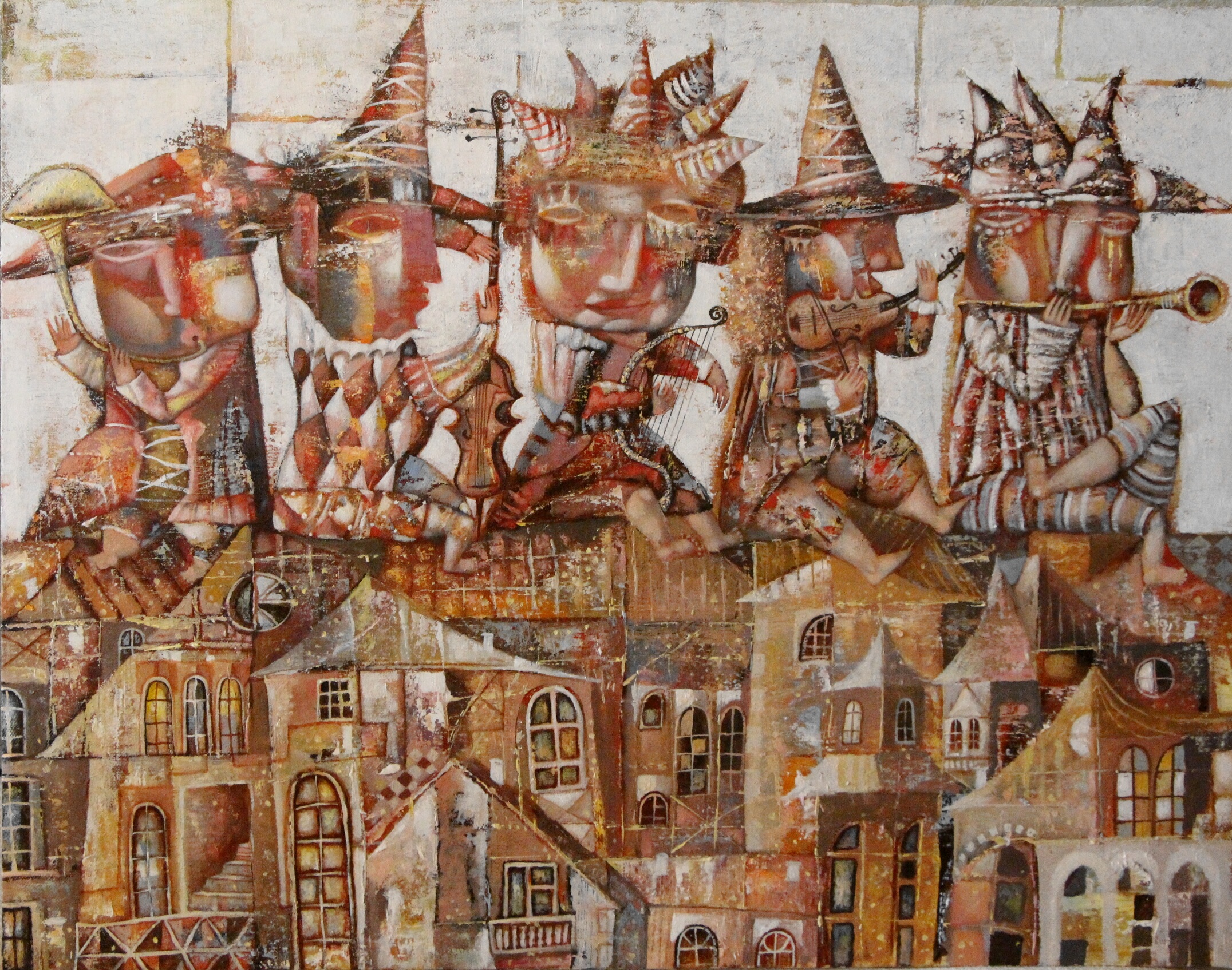 The scene resembles a scene from a fantasy theater: four characters in pointed caps and costumes with different paintings sit on the roofs of fairy-tale houses, surrounded by a complex mosaic of windows and facades. Each one plays a musical instrument, immersed in their own rhythm and melody, creating a feeling of street fun or a joke holiday. The coloring of the painting is graphic, restrained, the center of the composition is the rhythm of the roofs and broken lines, which adds magic and mystery to the game.