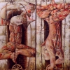 Before us is a diptych: two unusually curved figures in theatrical poses, like puppet dolls, sit and hang on wheels and characteristic "threads". The poses are unnatural, deliberately theatrical, with emphasized curves of the bodies. The color scheme is close to flesh-ochre, with golden and scarlet accents. This is a reflection on human nature: do we control or move our own destiny, where is the border between the game and reality?