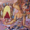In the foreground is a woman with a thin, curved neck and refined facial features, gracefully sitting in a translucent dress. In one hand she holds a tall vase with a scattering of bright cherries, in the other - two cherries. The background is composed of fragments of buildings, arched windows and colorful geometric shapes, as if the city exists somewhere inside and outside the heroine at the same time. The color palette is complex, dominated by purple, pink, warm shades, creating an atmosphere of summer dreaminess and light magic.