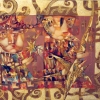 The plot is a decorative scene with two children's characters. They hold large stars in their hands, made with golden texture. Both are dressed in brightly painted costumes, their faces are thoughtful and a little sad, which gives the work a special depth. In the background there are golden curls, reminiscent of a fairy-tale or festive mood. The painting connects the themes of dreams, hope, magic and childhood, its visual language is rich in details and decorativeness makes the image almost mythical.