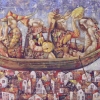 Again, the boat floats across the sky above the roofs - this time the boat looks like a fragment of a large string instrument. Four musicians in spotted, painted costumes are sitting in it: a trumpeter, a guitarist, a drummer, and a singer or composer with a book. All are united by the bizarre plasticity of their movements and grotesque headdresses, exciting with their non-standard dynamics. The background is bluish-lilac, morning, blowing with a slight melancholy for the meaningless, but beautiful holidays of childhood.