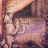 The painting is filled with enchanting mythology. The central character is a creature with a human face, long arms and an animal body, entwined with ornaments. It plays a long flute, decorative curls and leaves grow from its hair and mane. The background is mysteriously twilight, filled with pink-violet light, which enhances the mystical aura of the canvas. Everything around seems to vibrate from the music - a moment of immersion in a fairy tale, a myth, an ancient forest.