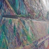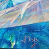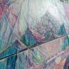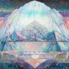 The work is an abstract winter landscape with a large mountain reflected in the water. The reflection in the water surface creates symmetry and a sense of duality. The mountain slopes are painted with many small triangles and patterns reminiscent of ice crystals. The color scheme is predominantly cold, with shades of blue, white, purple and soft pink, which gives the painting a feeling of light and coolness at the same time.