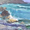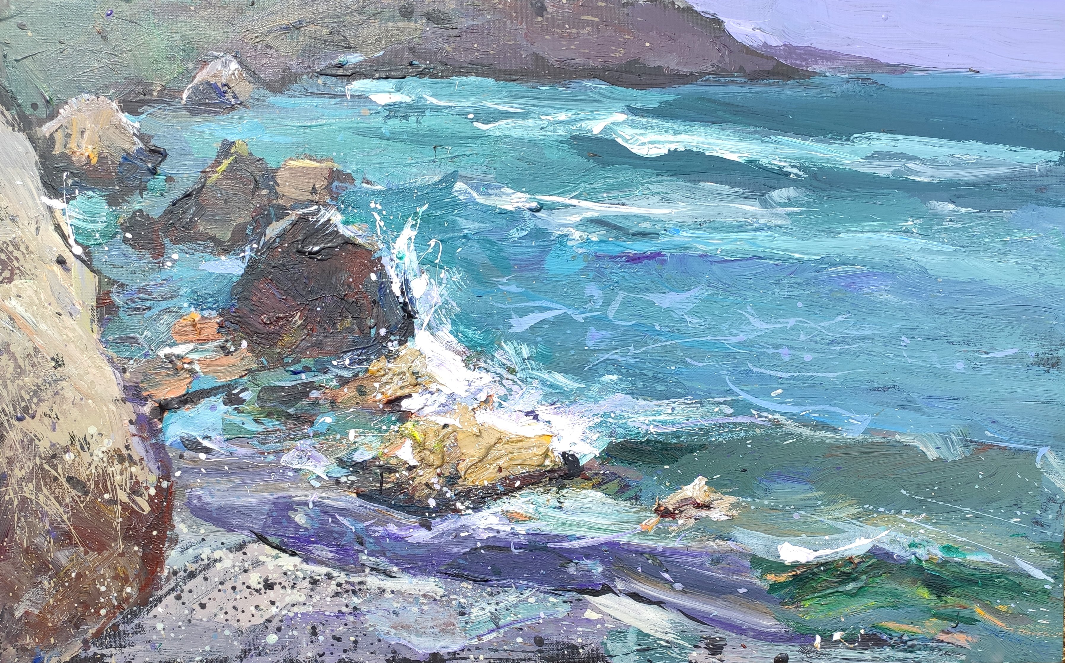 This painting immerses the viewer in the elements of the sea: the waves hit the rocks with force, throwing splashes in different directions. The rocky shore seems to recede into the distance, dissolving in a light haze. The artist's brushstrokes are varied - from sharp and pointed lines of water to smooth and soft contours of the sky. The palette is filled with cool blue, blue and violet shades, creating a feeling of fresh, invigorating air.
