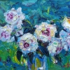 This canvas depicts a picturesque bouquet of lush peonies. The author uses thick, expressive brushstrokes of a palette knife, which gives the flowers a special texture and volume. The main shades are white, pink, with purple, yellow and green accents. The background is dominated by emerald and blue tones, reminiscent of garden greenery. The flowers are not painted in photo detail, but their vitality, multi-layered petals and slight shimmer of light are almost visible. The bouquet symbolizes the freshness of the morning, the beauty of nature and the fleetingness of the moment.