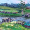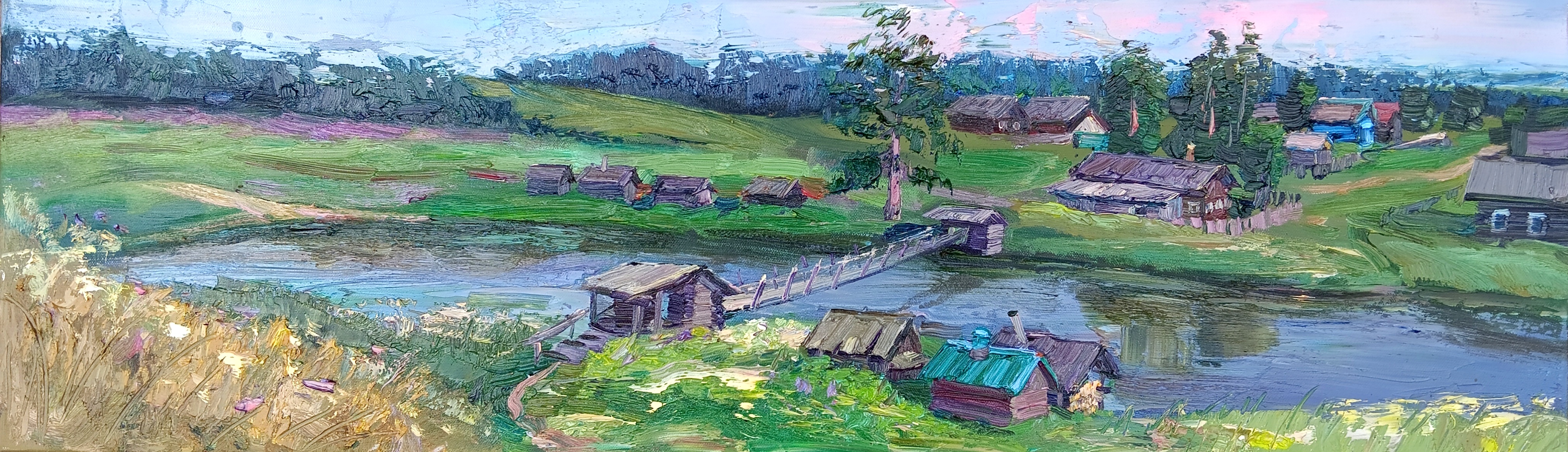 The canvas conveys an idyllic fragrant summer day in the countryside. Before the viewer's eyes is a cozy village, spread out on both banks of a small river. Simple wooden houses, bridges, wells, well-kept yards, bright fresh grass and many shades of green fill the scene with warmth and tranquility. In the background is a dense forest, heavenly haze and a light sunset with transparent clouds. The whole composition breathes peace, simplicity and love for Russian nature and traditions, evoking nostalgia for childhood and summer.