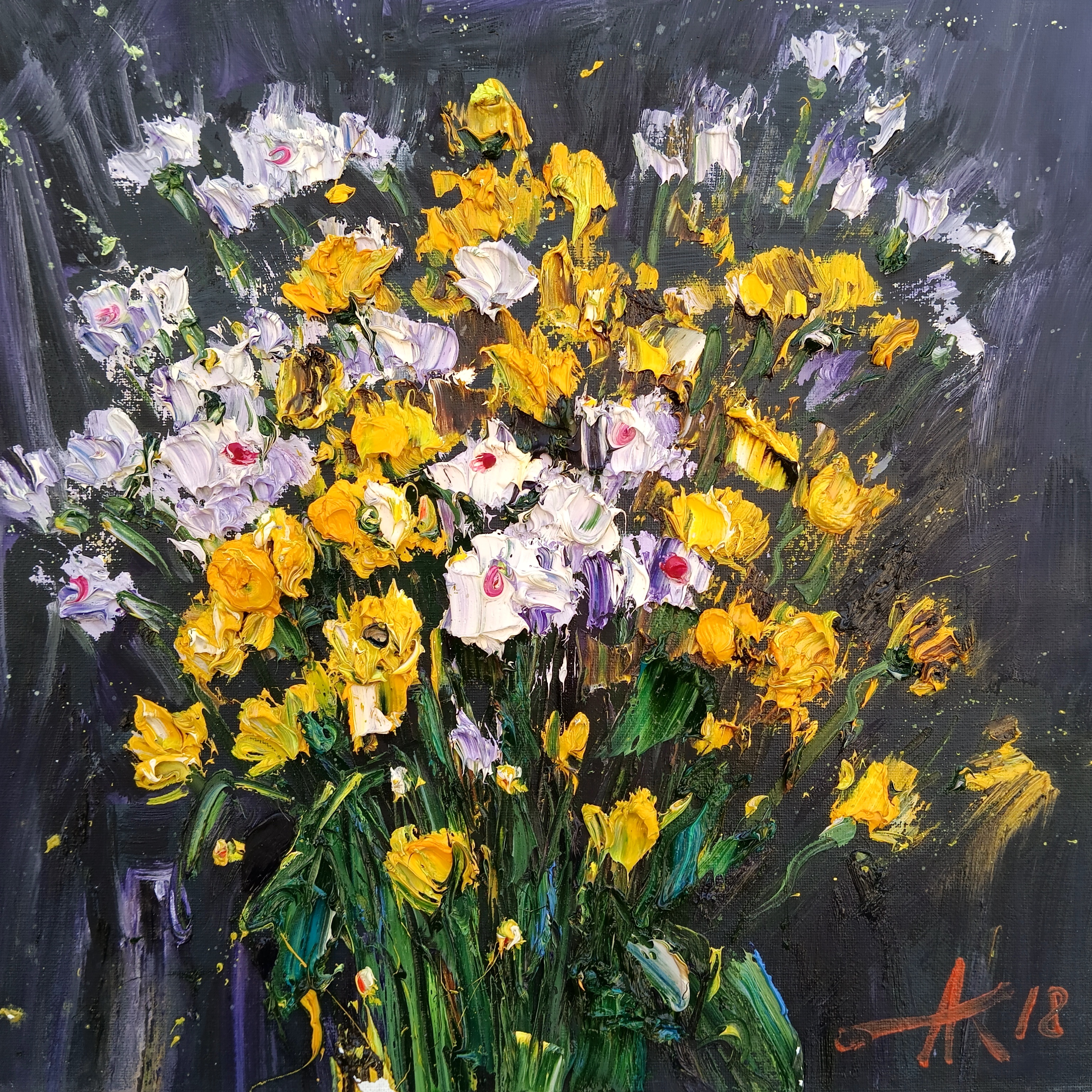 The painting is filled with the energy of spring and sunlight. A bouquet of yellow and white flowers stands out against the dark, rich eggplant background. Snow-white buds with delicate lilac and pink nuances are organically combined with rich yellow flowers, which gives the composition dynamism and cheerfulness. Energetic brushstrokes convey the freshness and naturalness of the bouquet, green stems and leaves add brightness and a sense of living nature. The work breathes warmth, joy and optimism.