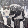 Before the viewer is the image of a village cat sitting on the fence poles in the middle of winter. Thick textured strokes juicily convey the animal's fluffy fur, snowflakes lying on its back, and the spirit of a real Russian winter. The background is done in cold silver-gray and blue tones, contrasting perfectly with the expressiveness of the cat's green eyes and its calm, confident pose. The painting evokes a smile, warm feelings and associations with peasant life, kindness and comfort.