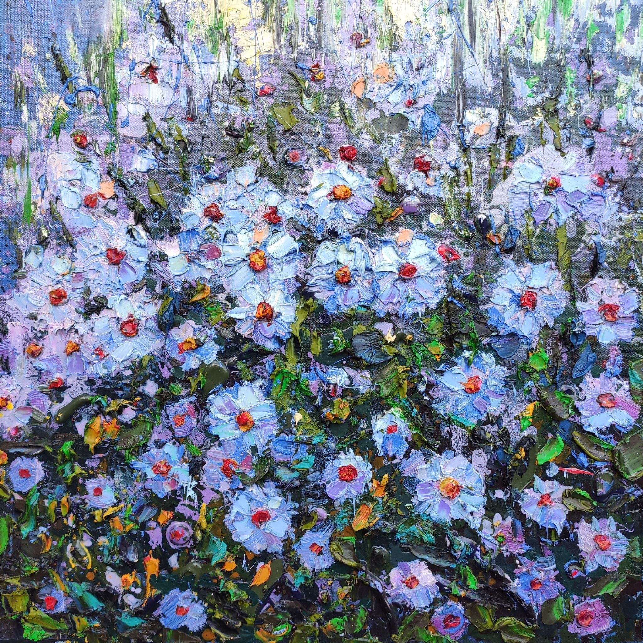 In front of us is a luxurious flowerbed, all strewn with large white and blue daisies, which seem to have just blossomed under the summer sun. The flowers are painted with a palette knife, with wide, relief brushstrokes, which creates the effect of extraordinary liveliness. The centers of the daisies are warm orange, thanks to which they become real "suns" among the cool palette of petals. The background is a light, airy haze with vertical halftones of greenish and lilac colors, which makes the flowerbed seem voluminous and real. The whole work is filled with a feeling of freshness and joy of a warm summer day.