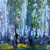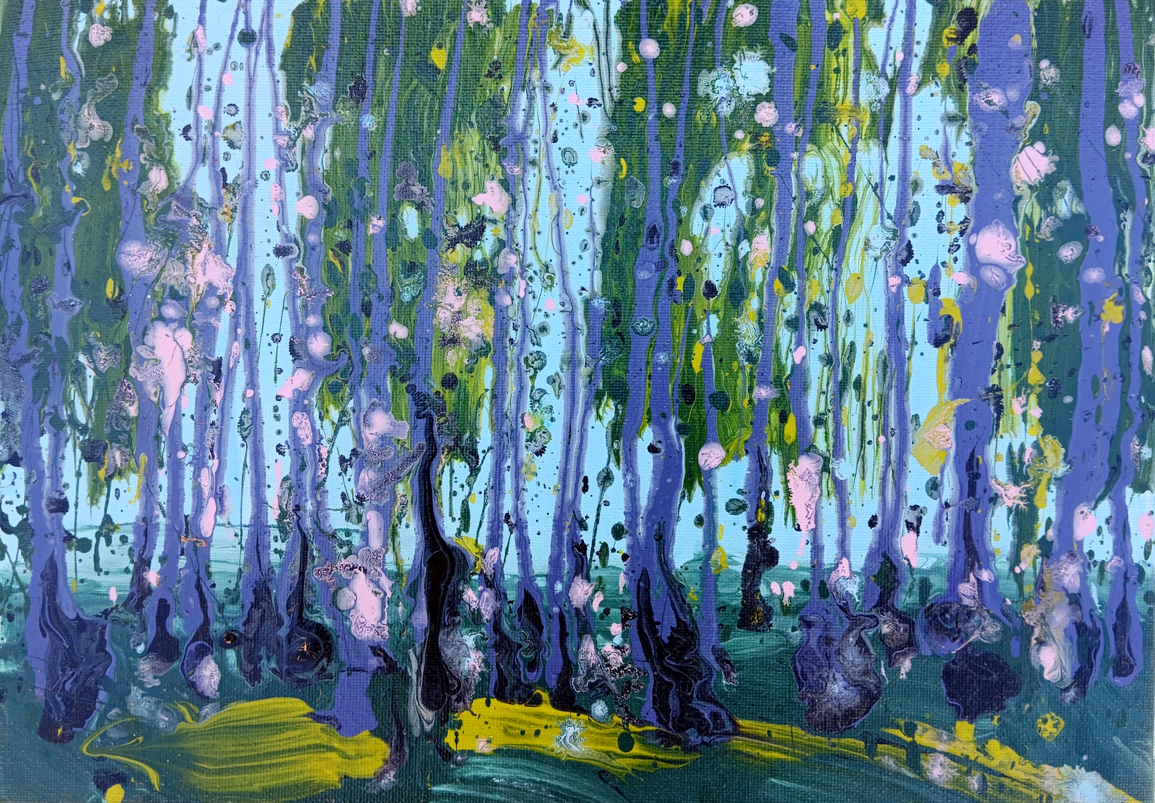 An expressive and stylized work in which the forest is conveyed by vertical dynamic brushstrokes of green, blue, purple and yellow tones. Through the transparent trunks and foliage, the soft blue sky is barely discernible. The painting is done in the technique of liquid painting: the paints seem to flow down, creating the illusion of trembling air and shimmering light in the foliage. Green and yellow stripes are visible at the bottom, giving the composition depth. Everything is painted freely, expressively - in this forest you can feel the breath of spring and the light, airy bliss of young nature.