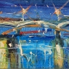 This work is dedicated to the cityscape at night. In the center is a curved bridge with openwork spans, decorated with lantern lights that are reflected in the water. The city sparkles with all sorts of colors: yellow, white, red, blue shimmer both on the bridge and in the reflections of the river, conveying the illusion of lights flickering on the surface of the water. The painting is painted in a lively manner, combining abstract and realistic elements: the details are slightly blurred, the outlines are conventional, and the energy and atmosphere of the night city turned out to be mysteriously attractive and a little exciting.