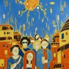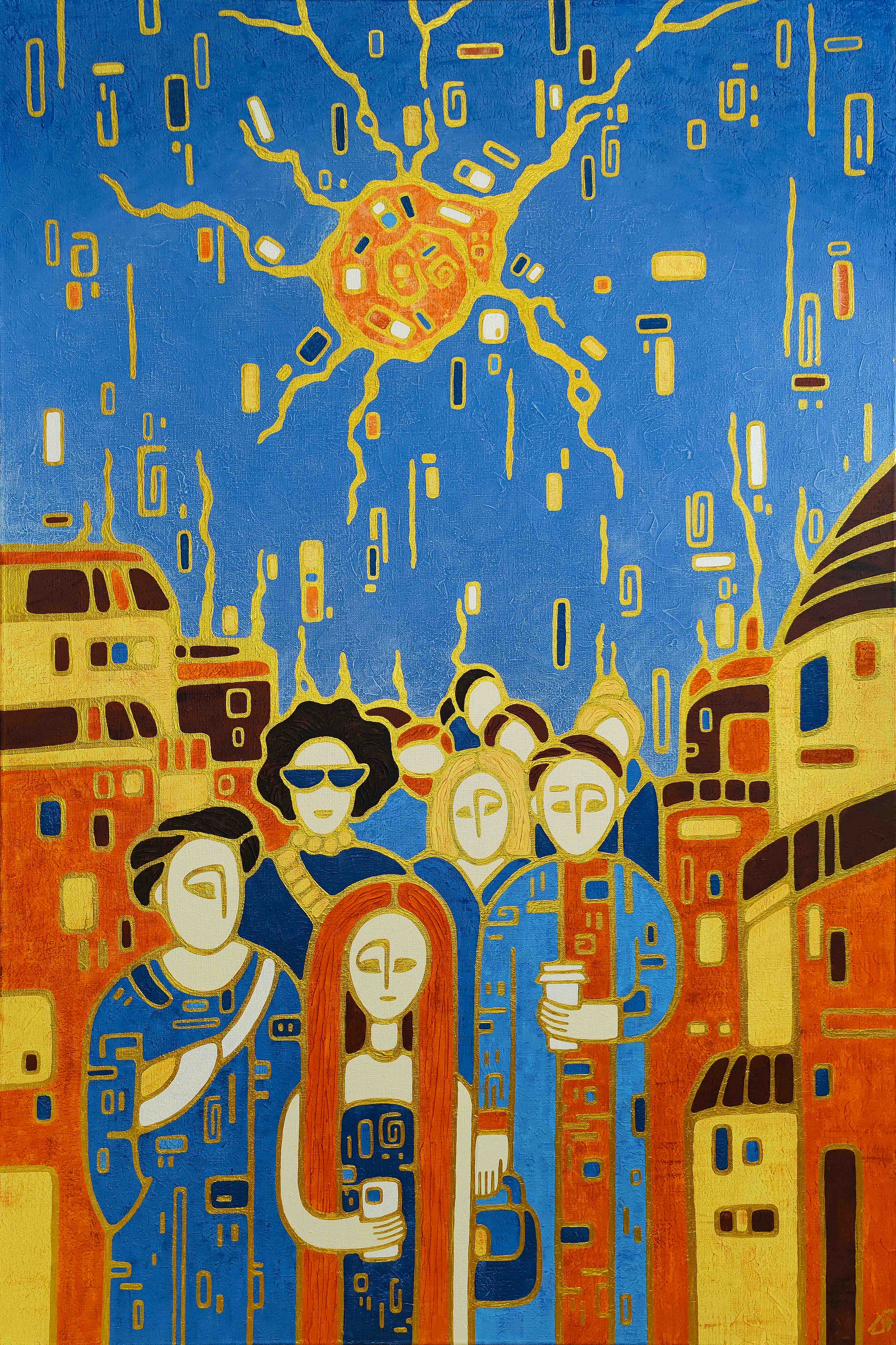 A dynamic work reflecting the movement and energy of urban life. Bright contrasts of blue and orange please the eye, and the characters in the center of the picture, with their slightly abstract features, create an atmosphere of surrealism and the unity of the human flow in the urban space.