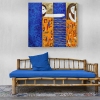 The painting creates the illusion of transitions between worlds, reflecting the harmony and interaction of opposites. Subtle shades of blue fill the painting with tranquility, and geometric patterns in a golden palette add depth and philosophical meaning. Two conventional figures symbolize a meeting or separation, drawing attention to the subtle connection between the lines of fate.