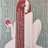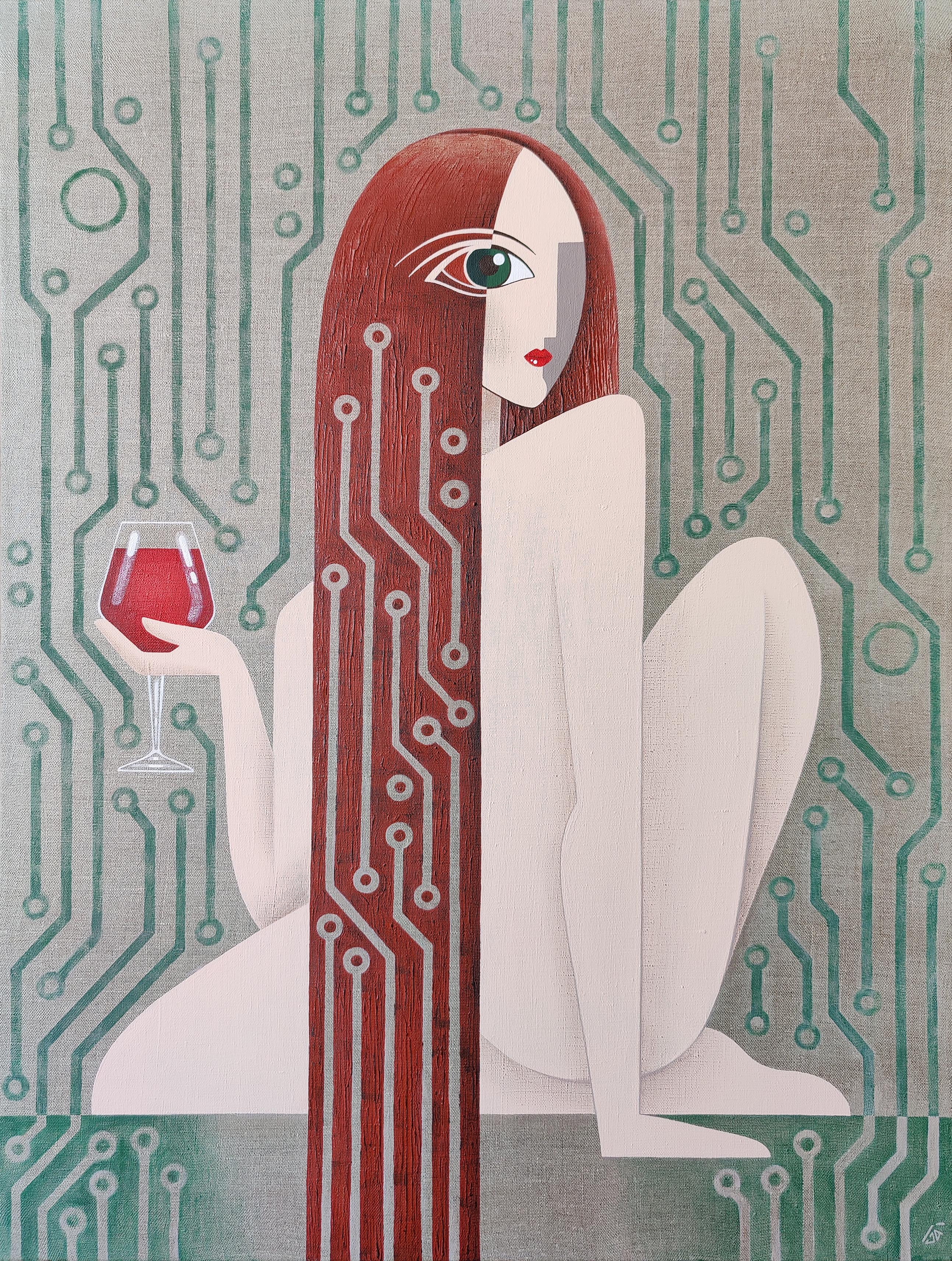 The image of a modern woman combines elements of comfort and anxiety. Against the background of gray-green schemes representing the technogenic world, the graceful figure of a woman with a glass of wine symbolizes an attempt to find inner harmony in chaos. Bright red hair contrasts with the muted palette of the background, emphasizing the strength of individuality and inquisitiveness of thoughts.