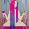 A bright and rich composition combining elements of the man-made and spiritual worlds. The heroine is choosing between a glass of wine and a capsule — a symbol of harmony between material pleasure and lofty thoughts. The background in the style of digital circuits emphasizes the philosophical ambiguity of the work.