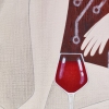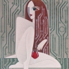 The painting subtly conveys an atmosphere of solitude and conscious relaxation. The cold gray background, decorated with diagrams, creates a sense of technological connection with the outside world, while a glass goblet of wine and the relaxed pose of the model hint at a moment of personal reflection and rest.