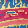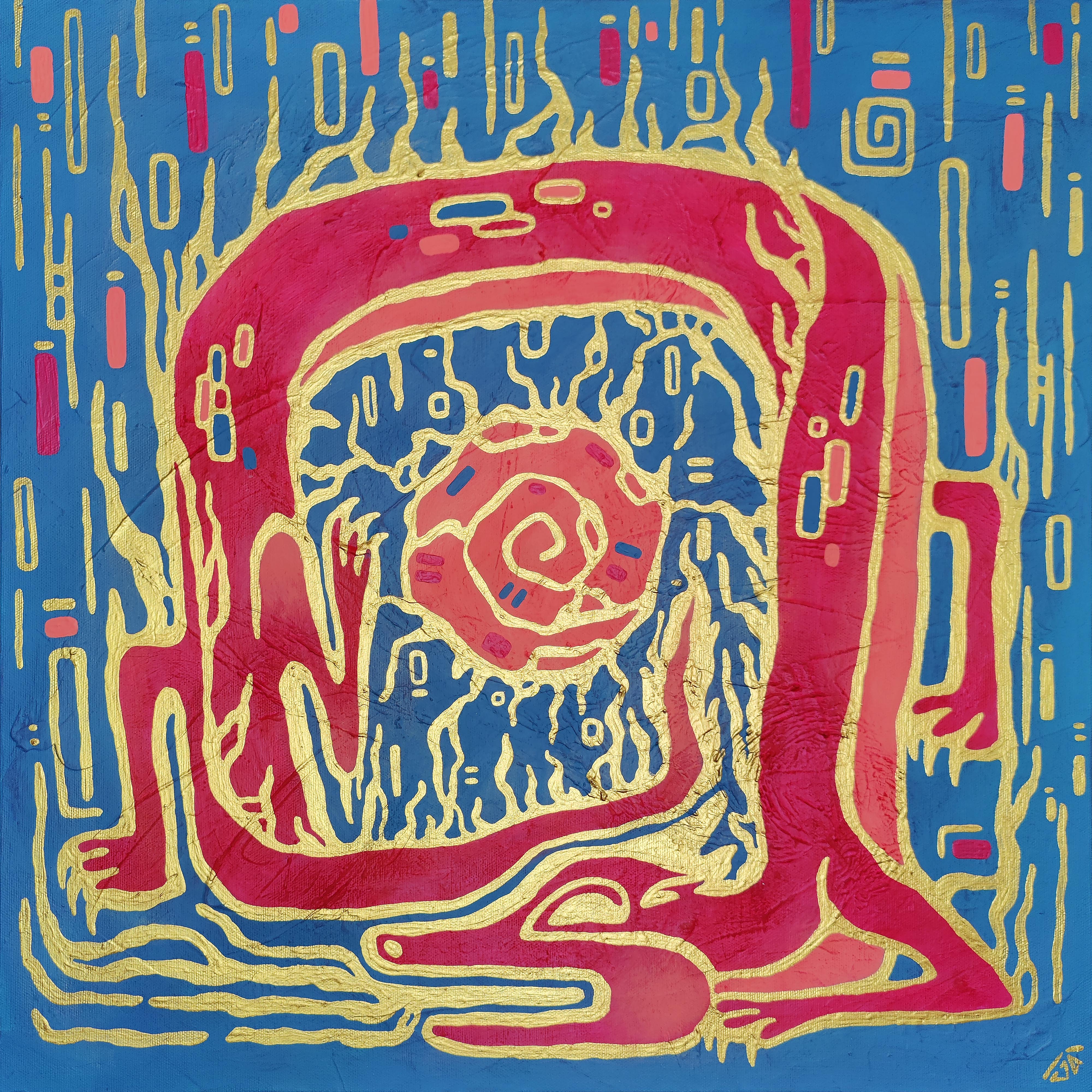 An expressive composition using flames and snake shapes. The central element is a bright sun, which seems to be embraced by a dragon. With red and gold shades in the details, dynamics and a sense of the eternal cycle of life are created. The painting personifies the power of nature, energy and the infinity of space.