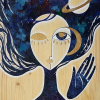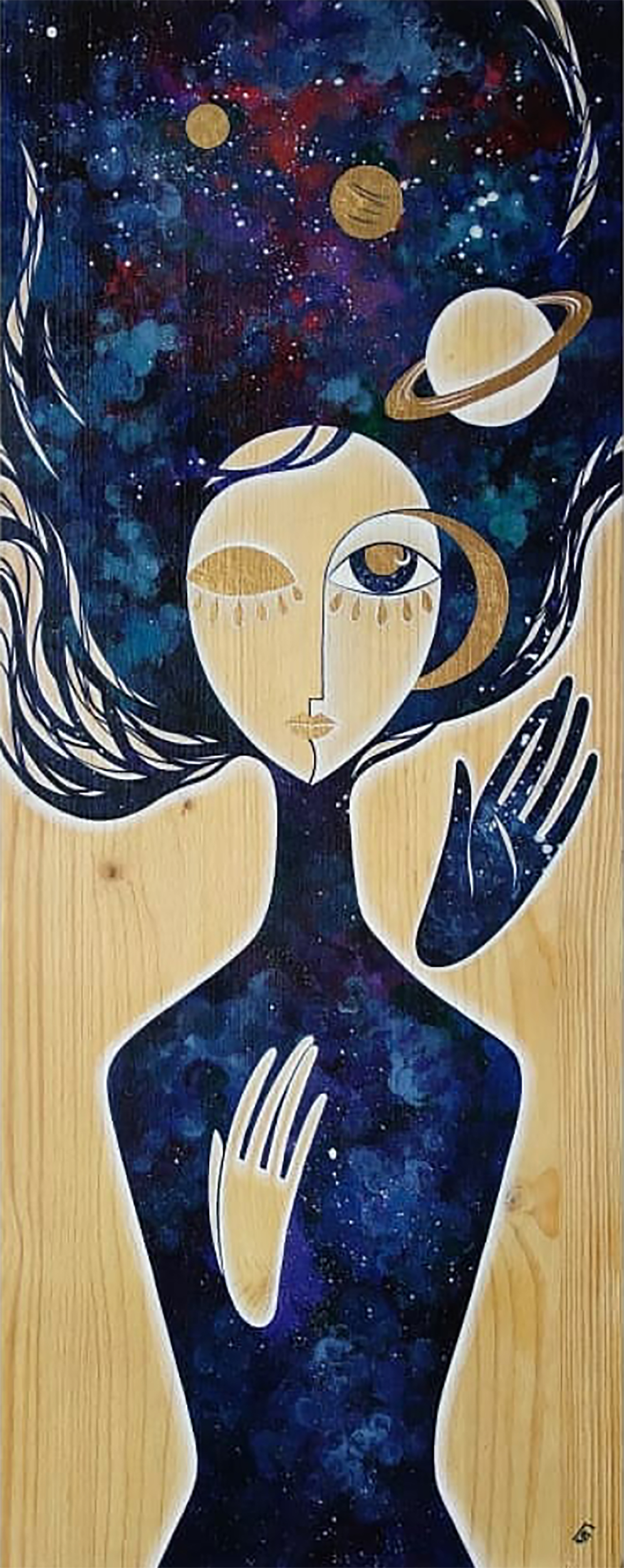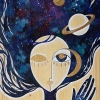 The author takes the viewer to a fantasy world where the woman herself becomes part of the cosmos. In her hair are stars and planets, in her eyes is the mystery of the Universe. The yin-yang motif, represented by hands of opposite colors, emphasizes the idea of balance. The painting embodies the connection between the inner and outer worlds, reminding us that each person contains an entire cosmos.