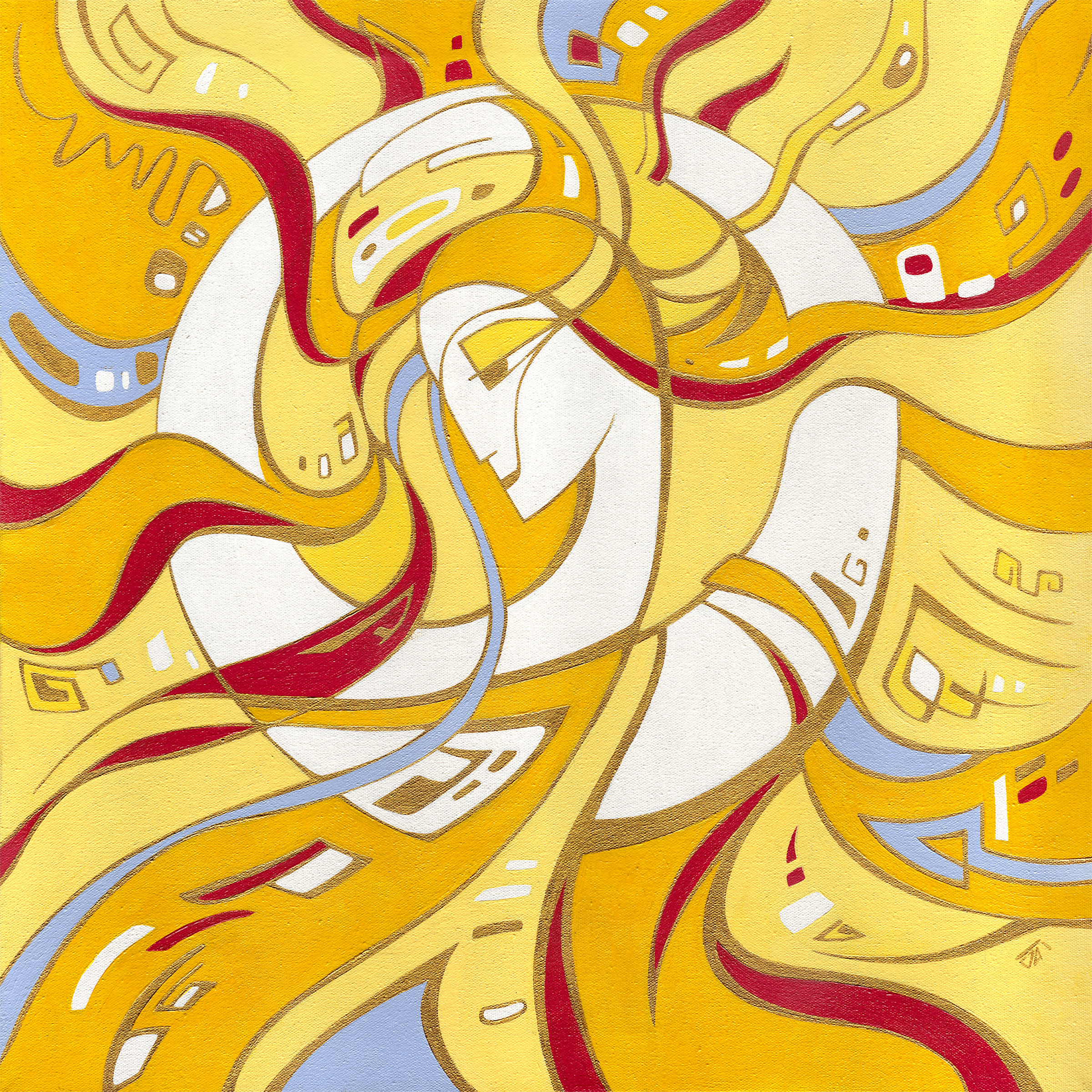 This vibrant painting captures the essence of energy and light, creating a dynamic composition that evokes feelings of warmth and joy. The swirling lines and bold colors depict a harmonious dance, inviting viewers to lose themselves in its rhythmic movement. The intricate details and bright hues come together to form an abstract representation of light, bringing a sense of brightness and positivity to any space.