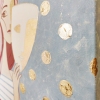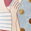 The girl's striped clothes, combining blue and green lines, are reminiscent of both a marine style and zebra stripes - can be interpreted as an allusion to the versatility of personality. The mask seems to cover or reveal part of the face, which emphasizes the conflict between the true "I" and the social, outer shell. Golden circles on a blue background give the work a festive and deep feel, while simultaneously reminding us of the inner light and individuality of a person.
