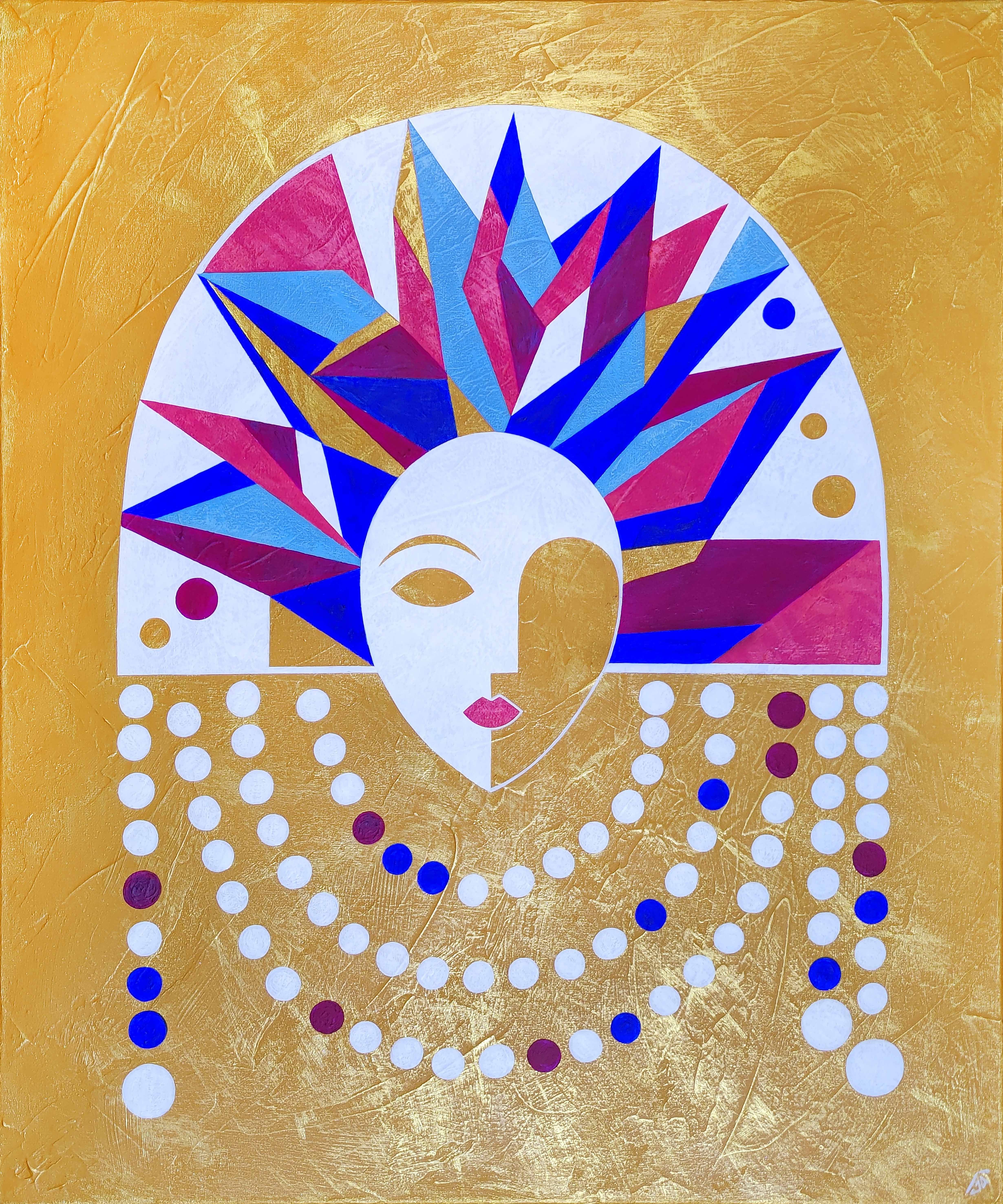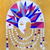 The painting embodies an image filled with symbolism and the dynamics of time. In the center of the canvas is a woman's face, divided into two parts, which can symbolize the change of eras or the diversity of the human personality. Above the face is an unusual kokoshnik, composed of bright geometric "shards" - fragments of pink, blue, light blue, purple and gold, reminiscent of both rays and pieces of stained glass. It is like a reflection of disparate memories or moments that come together to form a single mosaic of life. The background is done in gold tones, which gives the painting solemnity and a sense of eternity. Decorative pearl threads emphasize the connection with tradition and add a sense of luxury. The work harmoniously combines motifs of Russian national costume with a modern abstract style, inviting the viewer to reflect on the nature of memory and time.