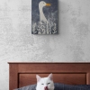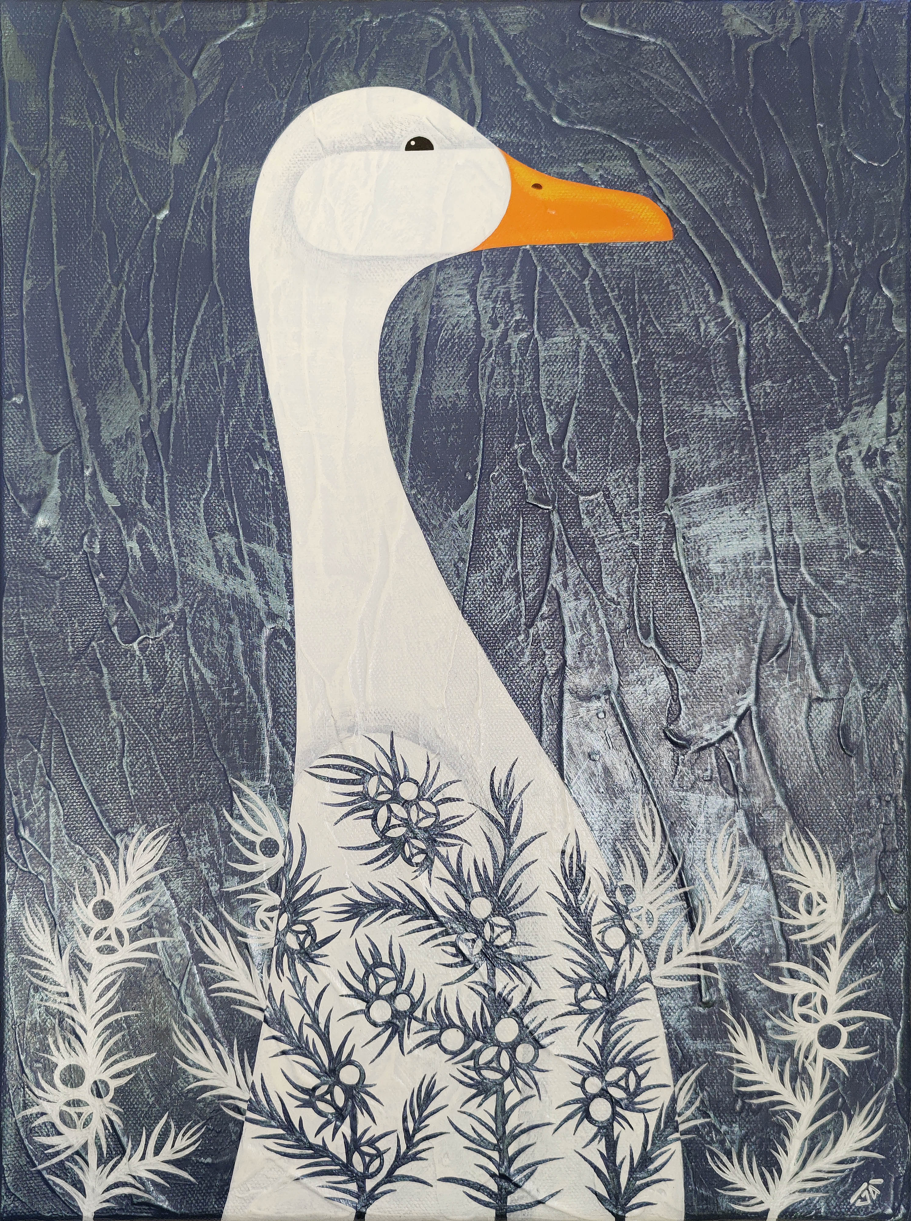 The series of paintings "Geese" is created in a decorative style that combines minimalism and elements of symbolism. The subjects are depicted graphically, emphasizing simplified shapes and lines, which adds sophistication to the works. The color palette is limited, enhancing the expressiveness of the paintings.