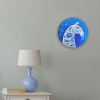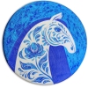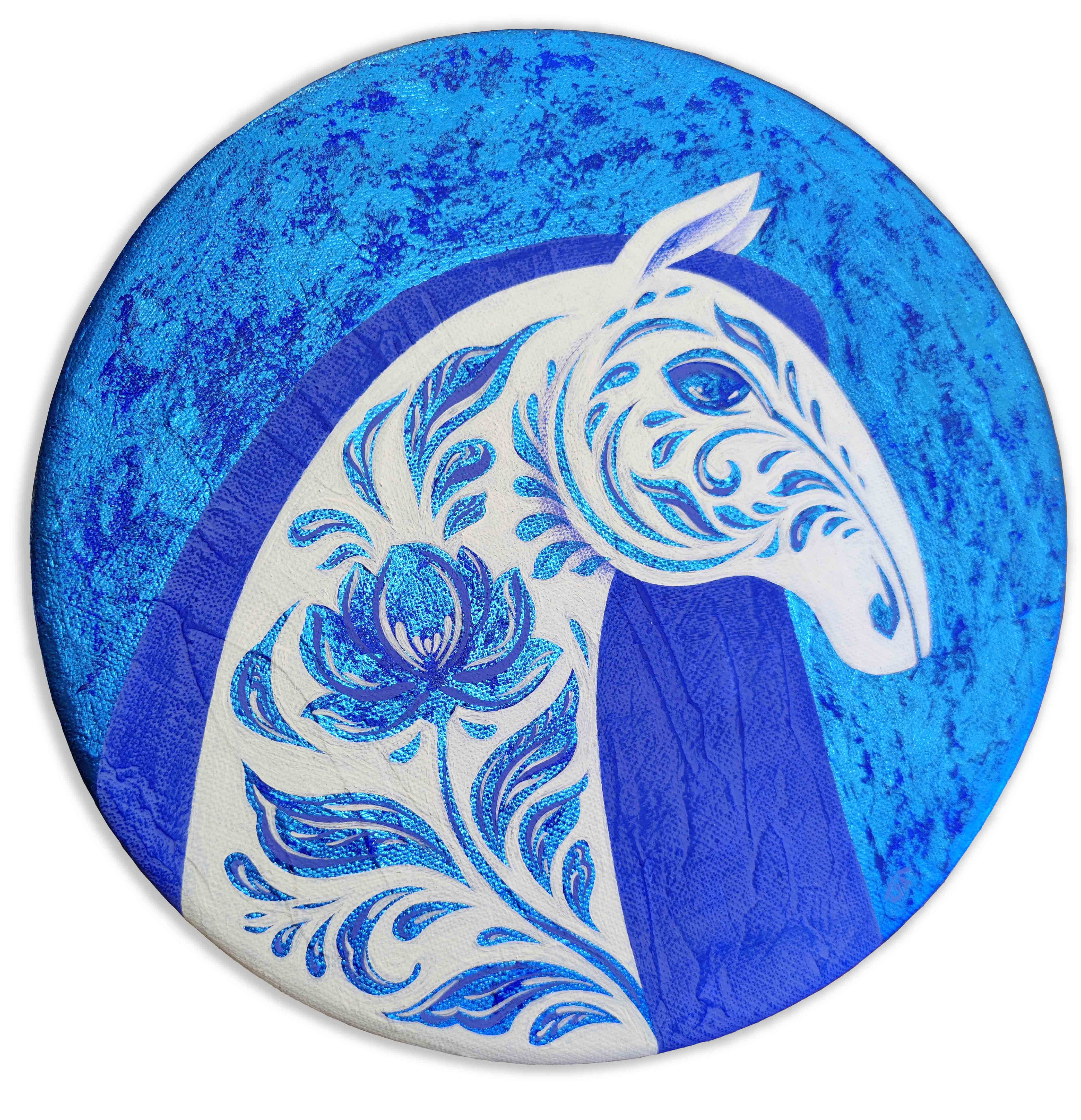 This piece is a harmonious blend of power and elegance, embodied in the image of a white horse adorned with a blue floral pattern reminiscent of traditional Gzhel painting. The combination of acrylic and blue foil on a round canvas creates depth and a shimmering effect, emphasizing the nobility and mystical beauty of the animal.