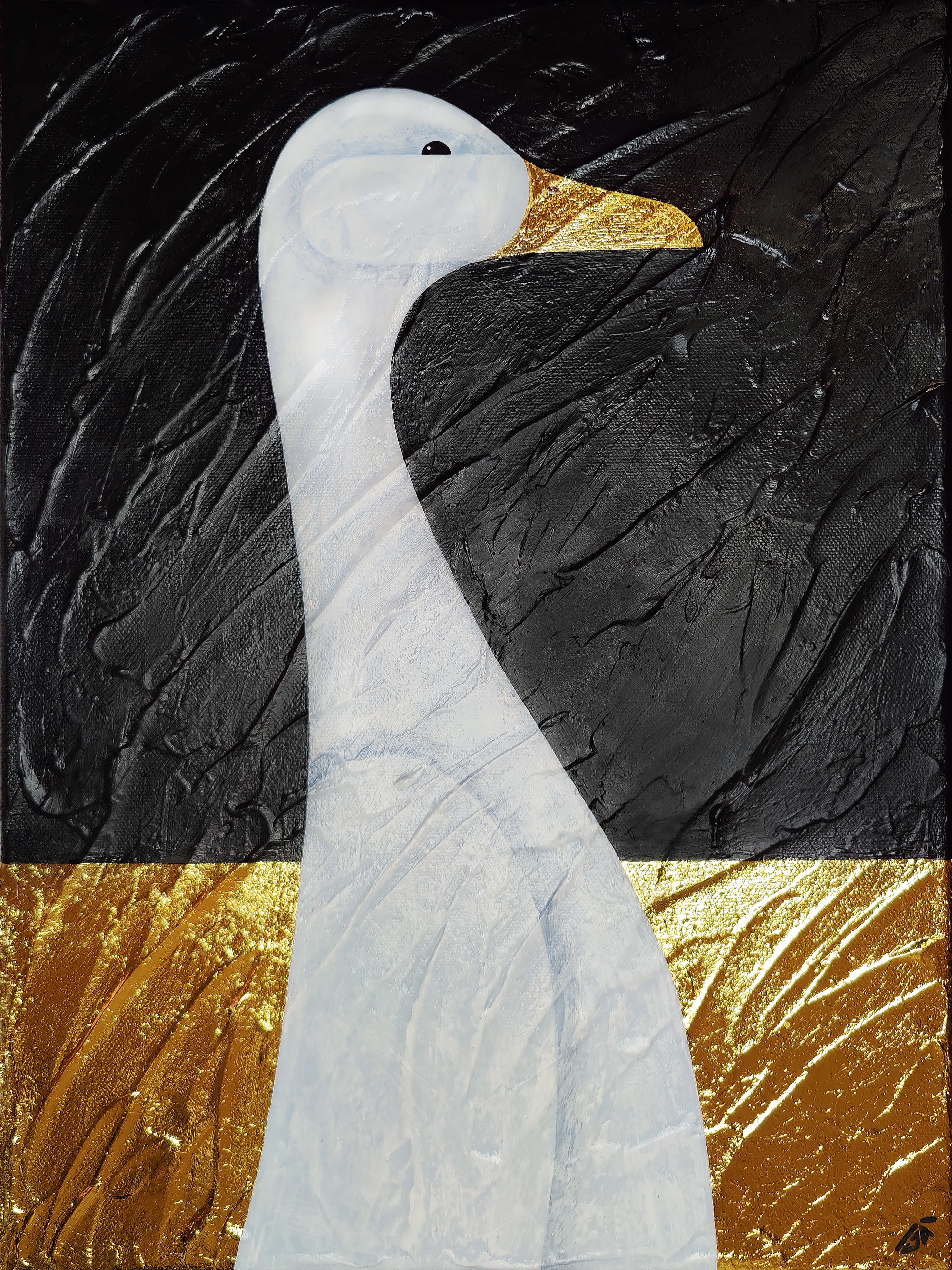 This original artwork, «Goose in a golden field of wheat», was created by contemporary Russian artist Yulia Belasla and is available for purchase online.