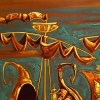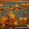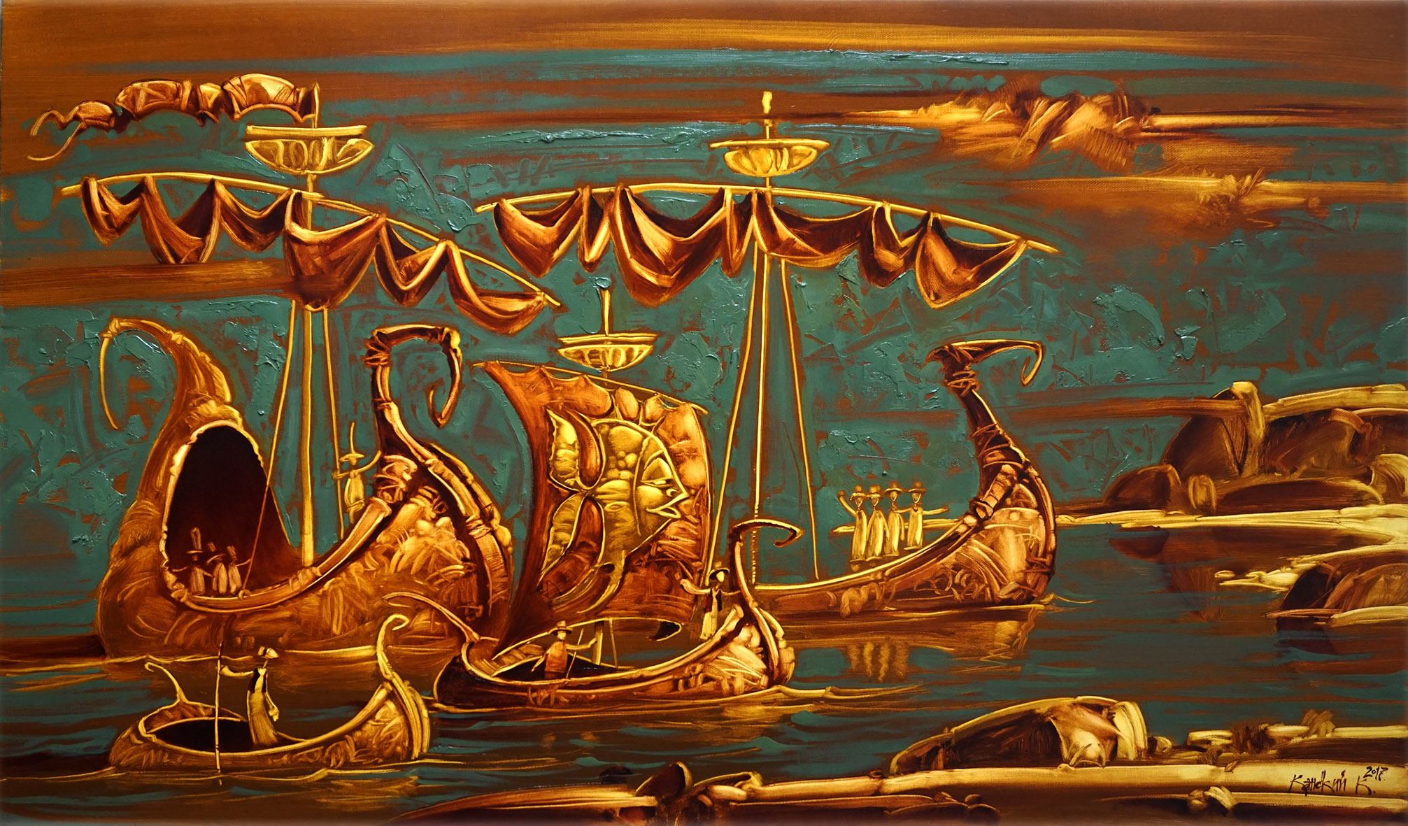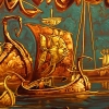 The painting depicts a fantastical sea scene with several decorative boats in the style of Vikings or ancient ships. They are rich in detail: dragon heads, patterned sails and sculptural decorations. The color scheme is golden brown against the deep blue-green sea, which gives the work a richness and mystical atmosphere of an ancient sea voyage. The painting is filled with symbolism, hinting at ancient legends and epic campaigns.