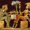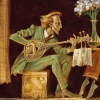 The work is a calm and somewhat bright scene inside a cozy room. A man plays a musical instrument, a woman listens, holding a glass of wine in her hand. Nearby is a dog sitting at the lady's feet. The figures are stylized, with pronounced emotionality and a play of light and shadow. The painting conveys the warm atmosphere of an evening in a friendly company, filled with music and communication.