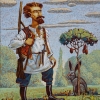 The painting depicts a male character in traditional clothing with a gun over his shoulder and wide boots. He is standing in the bosom of nature, next to a tree under which a cautious hare is hiding. The clouds in the background are filled with a quiet coolness, green bushes and grasses create a lively but calm atmosphere. The man looks thoughtful and balanced, as if preparing for a hunt or waiting for something important.
