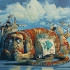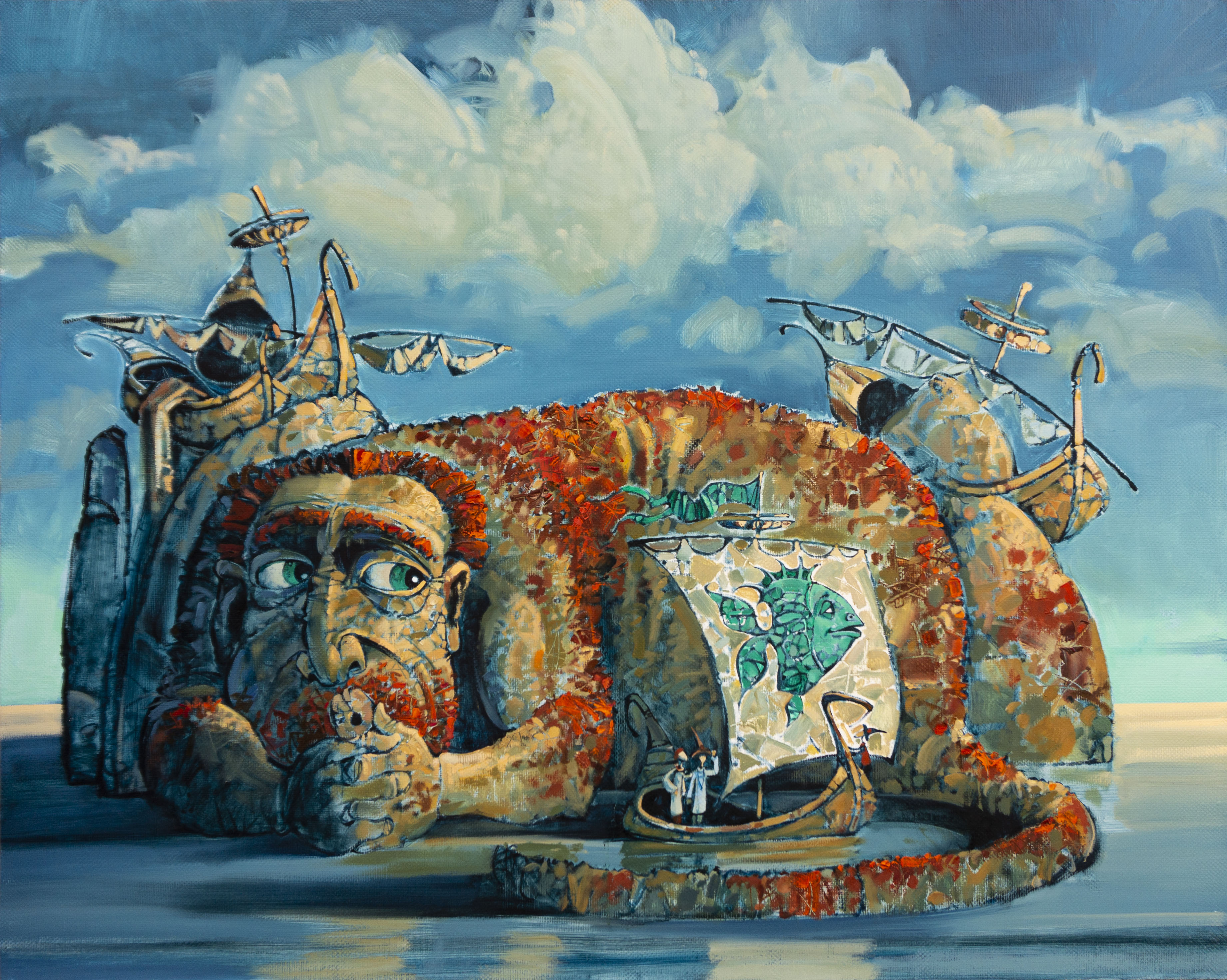 The painting returns the viewer to the marine theme: a huge fantastic beast, reminiscent of a sleeping giant, lies near the shore. Its body is decorated with fish on a cloth, and two boats with sails and a couple of figurines are attached to its back. The image combines mythology, nature and the dream of great travels. The colour scheme is predominantly cool, with contrasting rich reddish and green tones, creating an impression of depth and mystery.