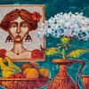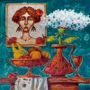A warm still life with a portrait of a blooming girl. White flowers and fruits are symbols of youth, brightness, and beauty. They emphasize that everything is blooming and smelling here and now. She's a little sad, but everything will be fine.