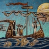 В центре композиции картины — старинная, богато украшенная лодка, плывущая по волнам. В лодке находятся три стилизованные фигурки людей, возможно, моряков или путешественников. Их одежда и головные уборы напоминают средневековые или фольклорные костюмы. Один из них машет рукой, словно приветствуя или прощаясь.