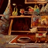 The space around him is filled with artworks and whimsical objects. Above the man's head hangs a large painting depicting a stylized animal surrounded by abstract forms. Under the table sits a stylized figure of a cat reminiscent of fairy tale characters.