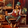 The composition centers on a human figure seated on the right, surrounded by art objects and decorative elements. This character, with distinct facial features, a mustache, and beard, is dressed in an elegant yet slightly eccentric outfit: a striped vest, blue trousers, a scarf, and a tall green top hat. He holds a glass in his hand, and his pose and gaze convey a sense of thoughtfulness or enjoyment of the moment.