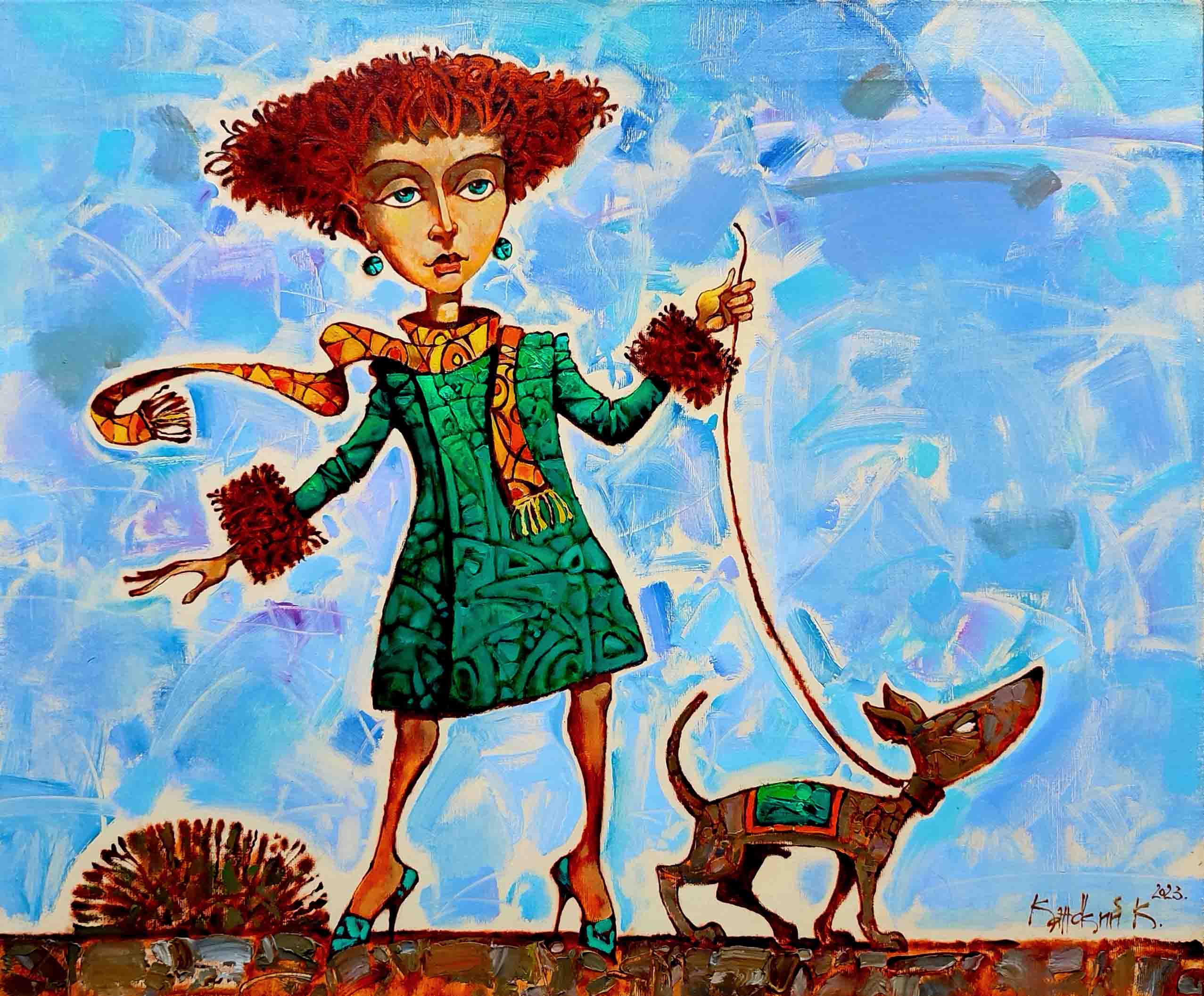 «Walk» by Konstantin Kansky is not just a depiction of a person and an animal, but a vivid sketch about style, individuality, and everyday joys. The painting radiates energy, cheerfulness, and lightness, inviting the viewer to smile and enjoy this bright, unusual spectacle.