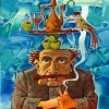 On the man's head, as if on a pedestal, is an entire composition floating in the air: three green apples supporting a tray with wine, cherries, a jug, and even a stylized bird. This structure, balancing on his head, is a powerful metaphor for «meditation»—the pursuit of balance, inner peace, and the ordering of thoughts.