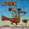 The composition of the painting centers on two main figures: the rider and his unusual steed, resembling a fantastic bird. The rider is depicted with an elongated angular face, beard, and mustache, giving him the appearance of a noble yet slightly eccentric knight. He is dressed in a vest and shirt, his posture conveying determination and confidence. In his hands, he holds a banner featuring a fish — possibly the very «symbol of good luck».