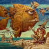 The canvas depicts an incredible scene: against the backdrop of a stormy sea and rocky shore, a musician wearing a pointed hat passionately plays a stringed instrument. But his listener is not a human, but a gigantic, intricately detailed fish resembling an ancient creature. Small fish hover above it, and behind them, a strange ship sails across the sky's surface.