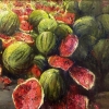 Before the viewer is a still life full of energy, color and volume. Bright green watermelons are adjacent to juicy scarlet cuts, inviting you to taste the summer, coolness and sun. Fresh brushstrokes convey the play of light on the rinds and juicy pulp, awakening the appetite and slight nostalgia for bright market days. The painting is filled with juicy, natural colors and creates the illusion of the smell of ripe fruit.