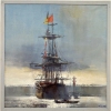 In the center of the canvas is a majestic sailing ship, calmly standing on the water. A gray-blue atmosphere envelops the entire scene, creating a feeling of light haze and morning coolness. Bright signal flags crown the masts of the ship, adding colorful accents to the restrained range of the work.