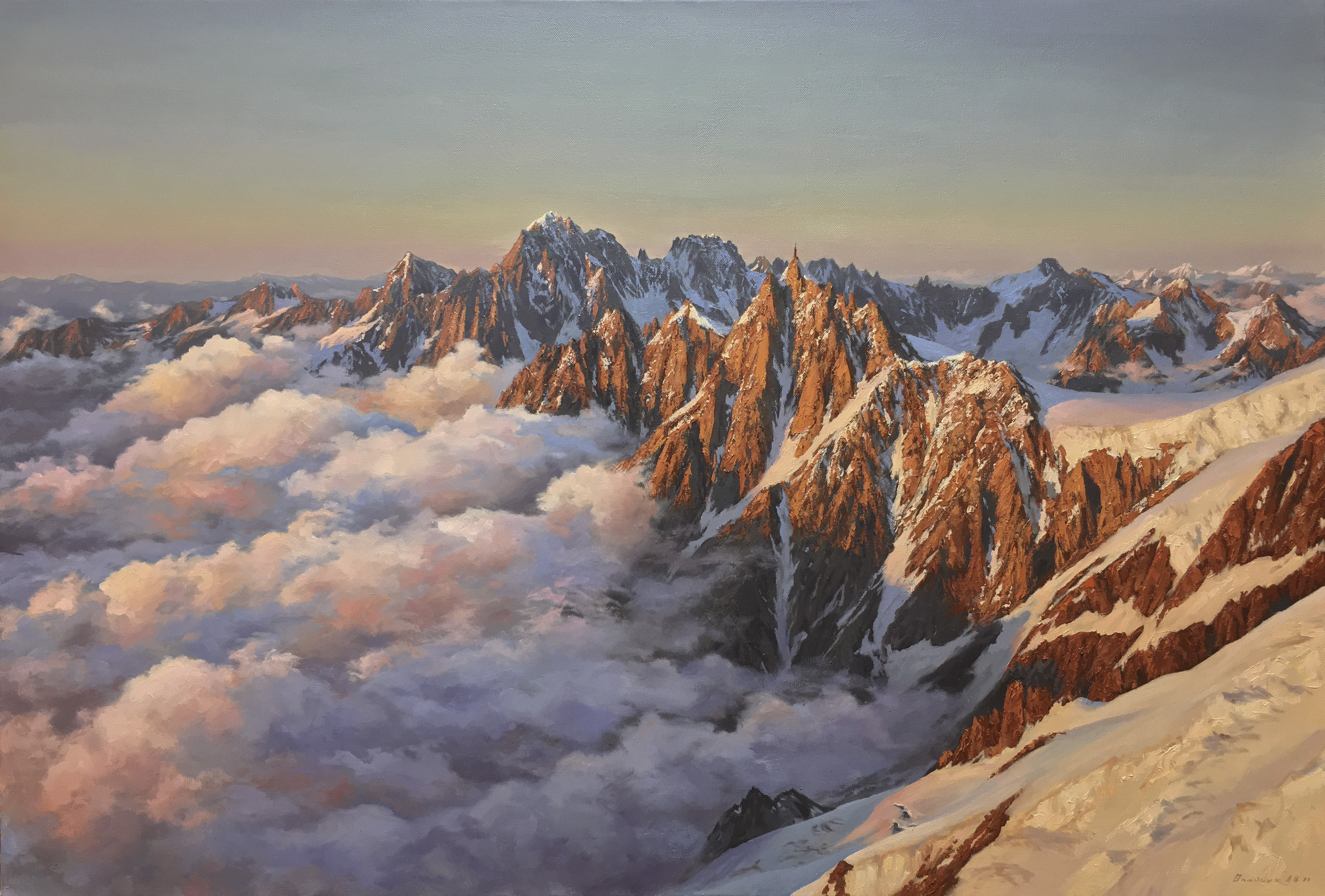 In this canvas, the artist masterfully conveyed the grandeur of the high mountain range, bathed in the soft light of the sunset. Sharp mountain peaks, framed by snow, rise above a rich, fluffy mass of clouds. The rays of dawn or sunset give the mountains and clouds a warm golden-pink hue, creating a strong contrast with the blue sky stretching beyond the horizon. The deserted power of nature, the depth of space, the softly diffused silence - the artist focuses on the play of light and shadow, conveying the change of day and eternity of the mountains.