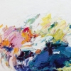 An abstract, almost minimalist composition. A splash of life flares up on the white canvas — an array of bright dynamic brushstrokes: lemon-yellow, pink-lavender, rich ultramarine and azure, which in places are drowning in white space. According to the general impression, this could be either a spring flower or a reflection on the surface of the water — however, the deliberate abstractness allows the viewer to fantasize the plot himself. The color palette is sensually sunny, light, with notes of optimism. The painting is conducive to dreaminess and creates an atmosphere of lightness.