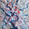 This dynamic artwork bursts with vibrant energy, characterized by sweeping brushstrokes in hues of blue, red, black, and white. The fluid motion of the abstract forms suggests a dance of colors and shapes, creating a sense of movement and vitality. The artist skillfully blends the contrasting tones, with softer pastel backgrounds providing depth and serenity. Bold strokes of fiery red capture attention, while cool blues and blacks create a sense of balance and harmony. The use of white adds a luminous quality, highlighting the swirling patterns. This artwork stands out for its ability to evoke emotion through its dynamic composition and masterful use of color, inviting viewers to lose themselves in its vibrant, abstract world. The interplay of light and shadow further enhances its captivating effect, making it a remarkable piece that resonates with rhythmic elegance.